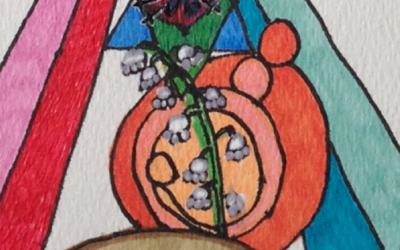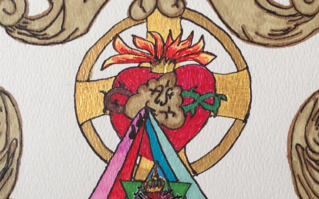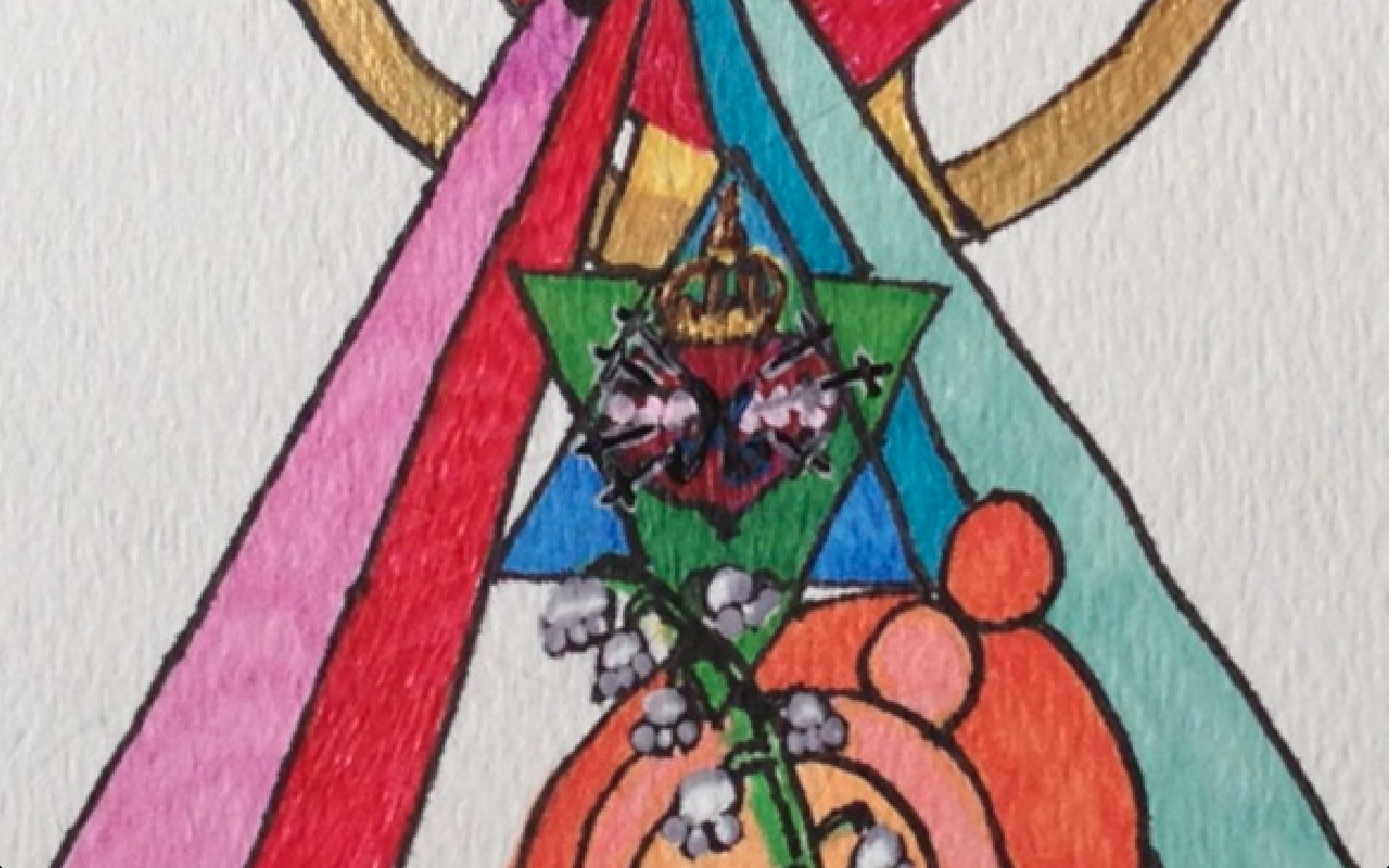 I used two triangles in union to symbolize Mary (blue triangle facing up to heaven) and how she was espoused with the Holy Spirit (the green triangle facing down toward earth). The Immaculate Heart (flowers on heart) of Mary is in the center of the two triangles with 7 swords (7 sorrows) piercing her heart. This is because I believe I have been called to build up her army and the secrets she holds enables us to crush the head of the serpent.