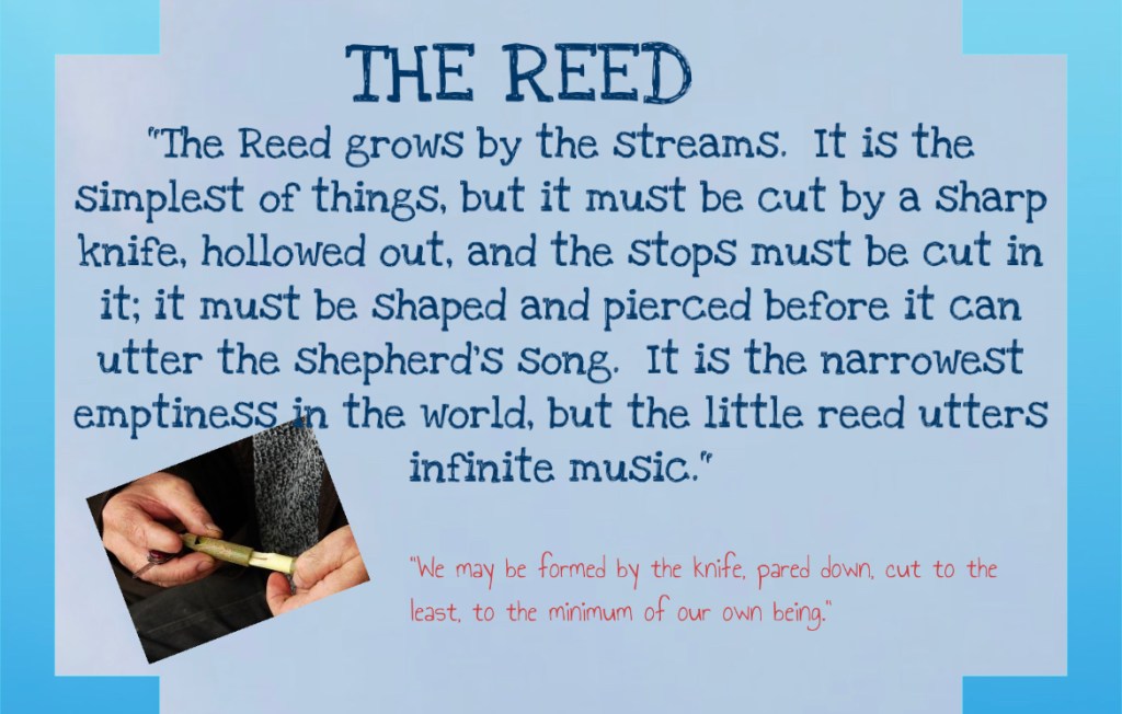 The reed is the final analogy. A reed is a weed that usually grows in marshes or ditches. It is cut and stripped and then finally hallowed out by a sharp knife and emptied of its soft insides.