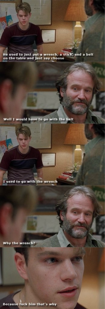 This lie created more and more problems the older I got. I argued with everyone. I was like Matt Damon in the movie Good Will Hunting. Matt Damon tells Robin Williams that when his step-father would beat him he made him choose between a switch, a belt and wrench and Robin asks him, “Which one did you chose?” Matt answers “The Wrench ” Robin asks why the Wrench? Matt’s answer is because F him that’s why. In my anger, I saw strength and I became my own protector.