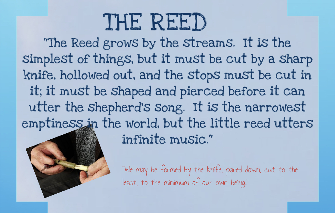 The reed is the final analogy. A reed is a weed that usually grows in marshes or ditches. It is cut and stripped and then finally hallowed out by a sharp knife and emptied of its soft insides.