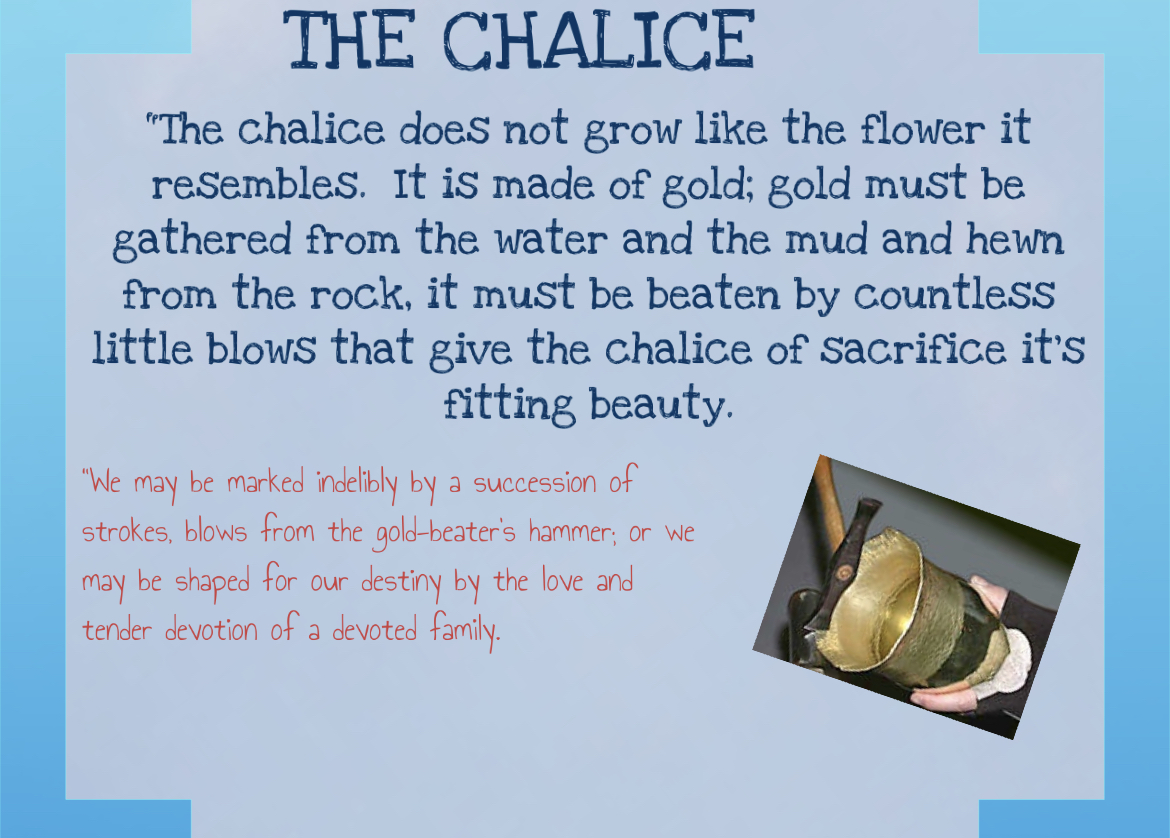 A chalice is formed in just this way and when filled it carries the blood of Christ to us. When those of you whose life resembles this process were formed, you understand sacrifice and transformation in ways others can not. God desires to fill you with truth, life and love in a way that can be carried to a world that is thirsty for and desperate for love.
