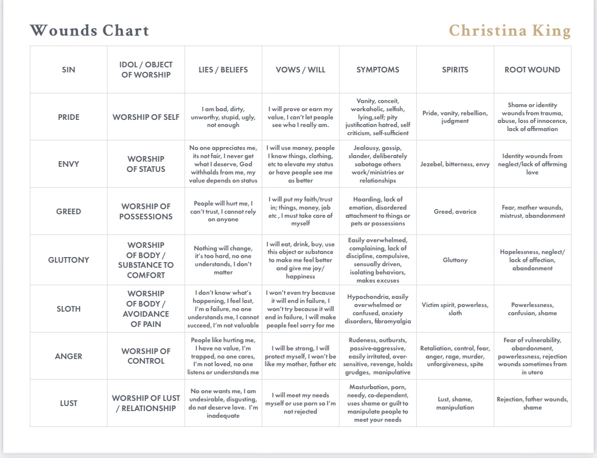 I do discuss it in more length in my book but this chart will get you started. Spend some time with it, invite the Holy Spirit in to speak to your heart on where He desires to set you free.